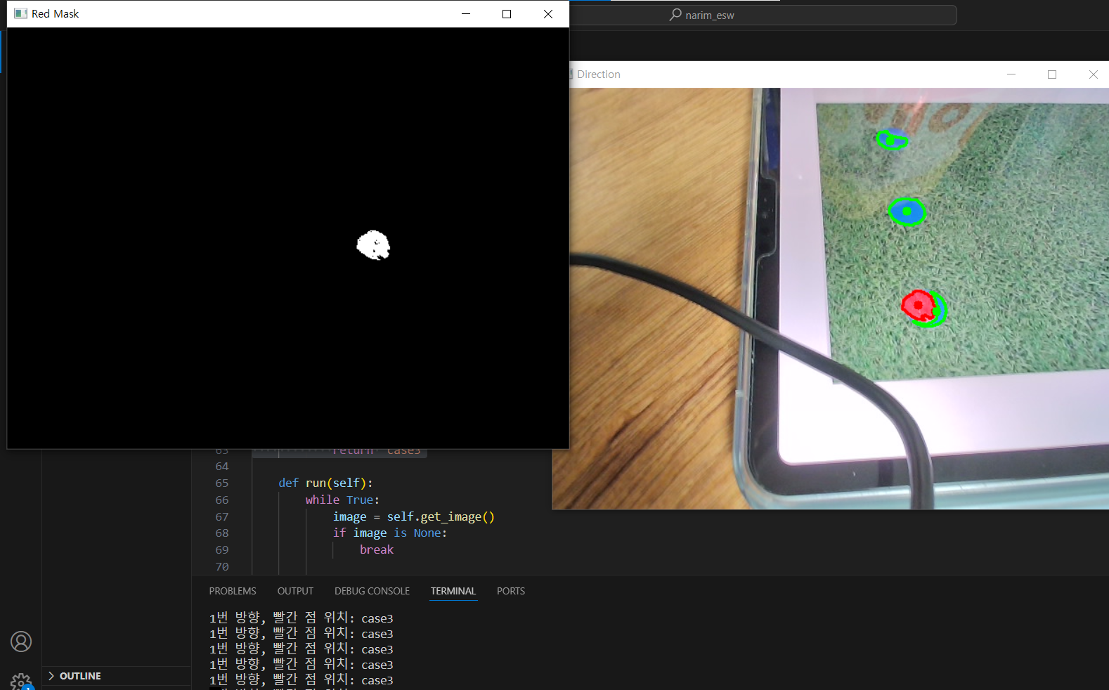 기존의 방향 결정 후(이전의 코드) 만약 방향이 "1번 방향"이고 빨간색 점이 검출된 경우,